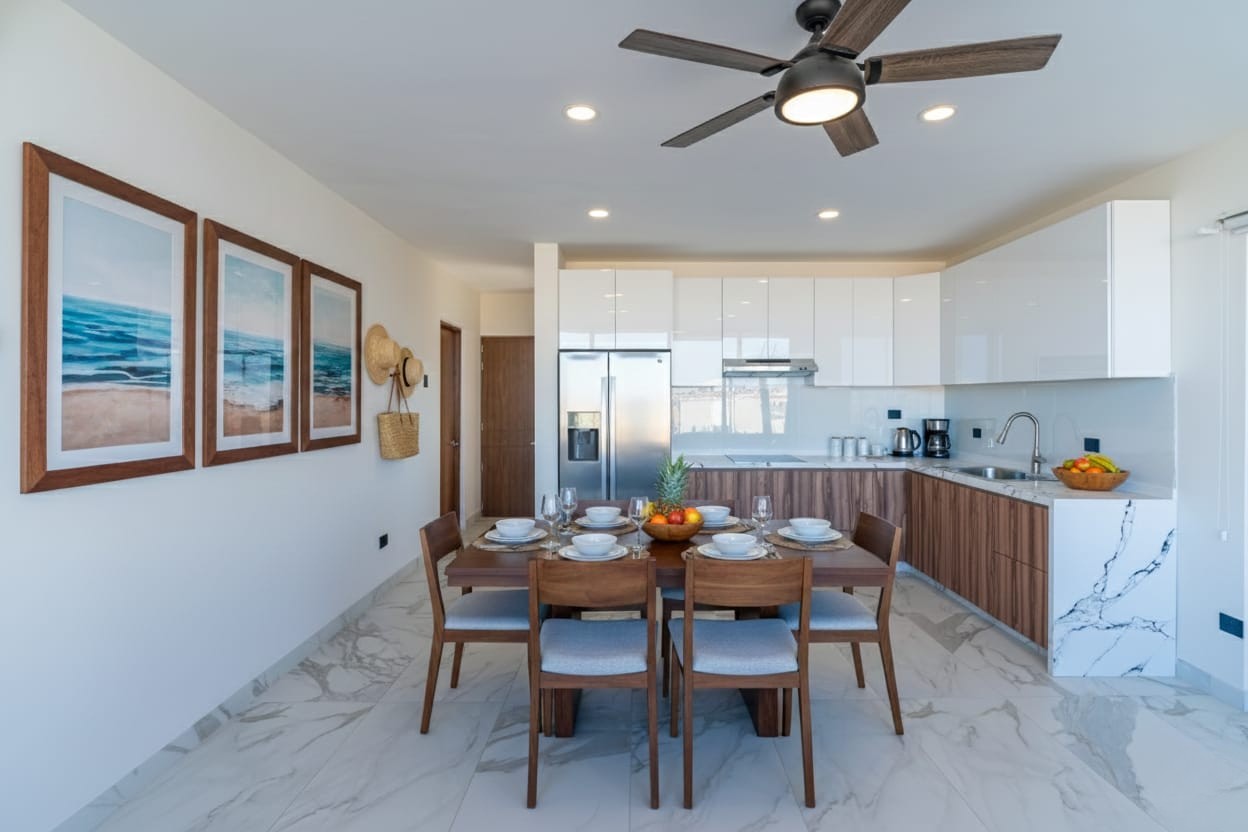 La cocina es cocina integral con gabinetes superiores al alto brillo, cubierta de Granito San Gabriel y Gabinetes en la parte de Alder y chapa de Parota. La canceleria es tipo europea para el correcto sellado de corrientes.